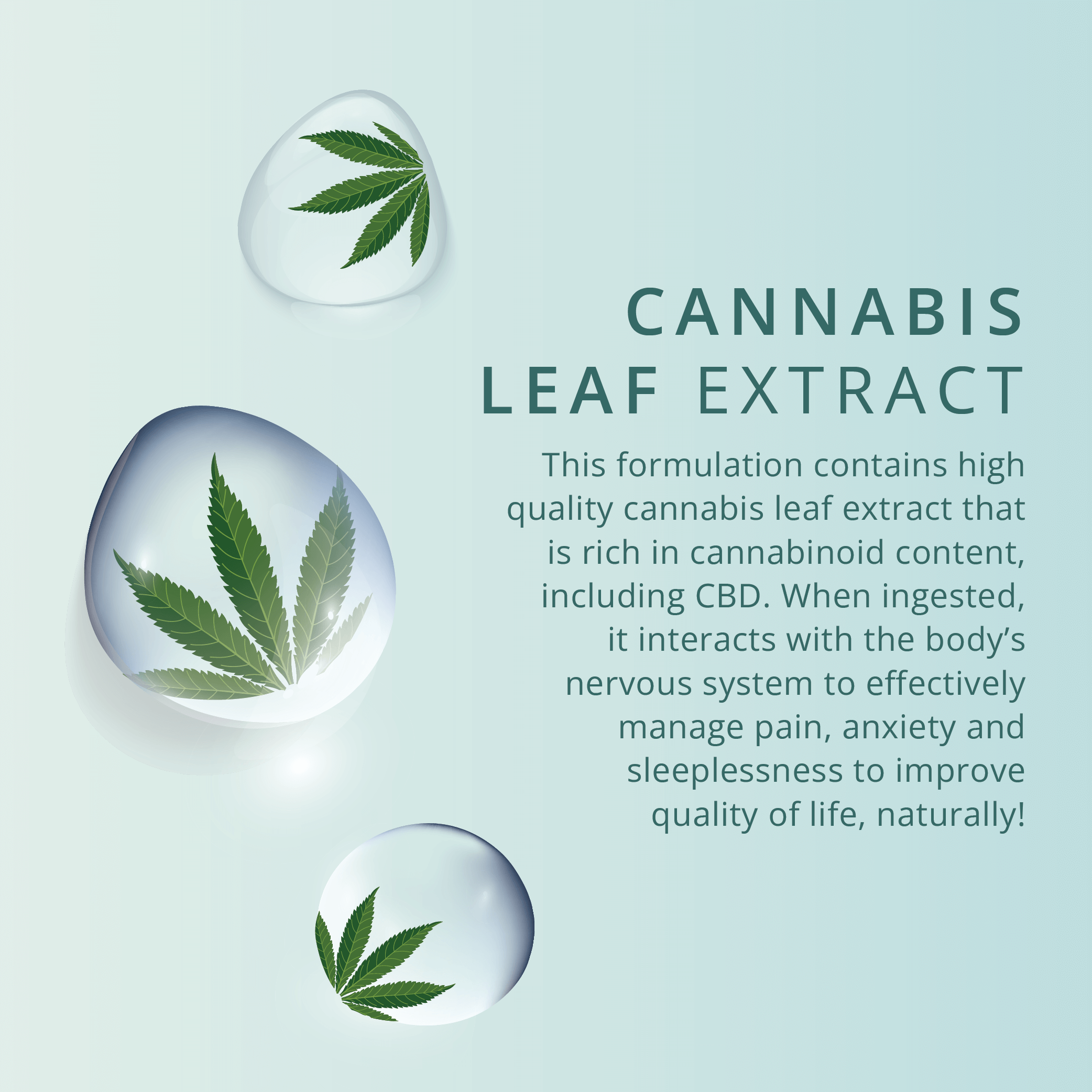 - Features the combined healing properties of all natural cannabinoids present in full spectrum cannabis leaf extract